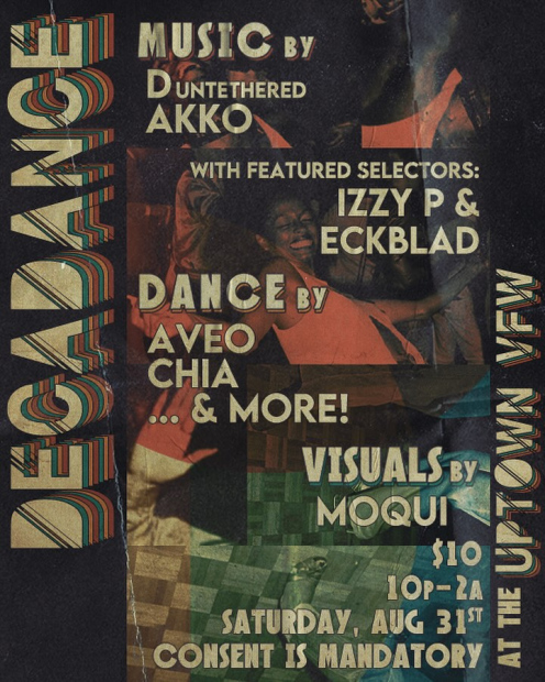 Saturday August 31st Decadance returns after a month off from our PRIDE party in late June.