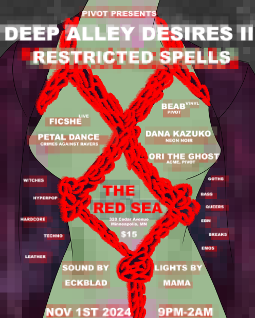 Deep Alley Desires II Venue The Red Sea Ethiopian Restaurant 320 Cedar Ave South Minneapolis, MN 55454 United States TimeFri, Nov 1 2024, 9pm - Sat, Nov 2 2024, 2am Promoter Pivot Price$15.00 Artists ficshe Beab Petal Dance Dana Kazuko OriTheGhost Genres EBM Industrial Hyperpop Bass Hardcore Techno Breaks Age Limit 21+