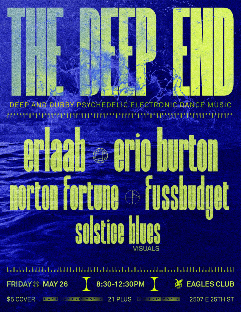 RETURN TO THE DEEP FRIDAY MAY 26TH! Back in the Buechner Room for more bass-heavy insanity. Rolling with a more eclectic selection this time around, with featured sets by erlaab and Eric Burton, and Solstice Blues on visuals. Resident DJs Norton Fortune and fussbudget are your gracious hosts. Come on down and get weird!