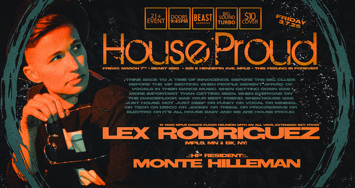 For this evening Lex is preparing something unique: theyโ€™ve requested to open the night, and you wonโ€™t want to miss this ALL VINYL, extended set. With over 25 years of history in the world of underground dance culture and 15 years since their last performance in the city, House Proud is thrilled to welcome back Lex Rodriguez for their highly anticipated Minneapolis debut after a decade of cultivating their sound in Brooklyn, New York.
