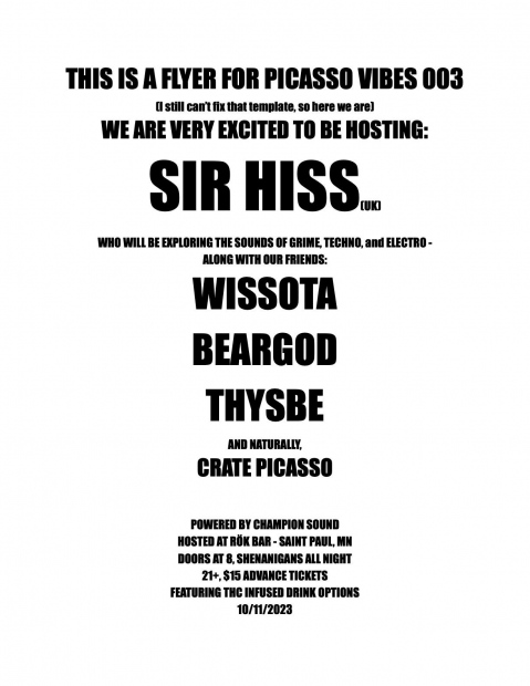 We are at it again for Picasso Vibes 003, this time exploring the sounds of grime, techno, and electronica with master of all 3, Sir Hiss of the sub.mission stable of artists. In support of him we have local legends Wissota, Beargod, and Thysbe, as well as less legendary locals Crate Picasso. Champion Sound shall be firing up the boom precisely at 8, and this is one youre going to want to make sure you are in the dance early for!