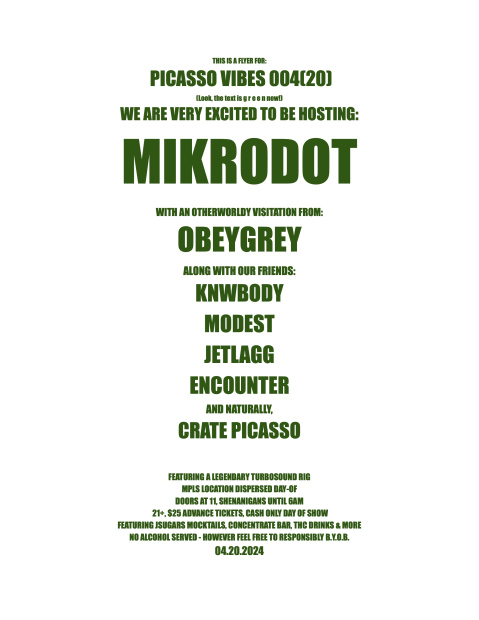 This will be taking place on a legendary Turbosound rig starting at 11PM on 4.20.24 and ending at 6AM on 4.21 so there is PLENTY of time to dance, tickets are $25 in advance and the price will go up at the door - come prepared as the door will be CASH ONLY. Please feel free to responsibly B.Y.O.B. if you wish to consume alcohol. Etiquette and dancefloor guidelines will be posted and expected to be adhered to.